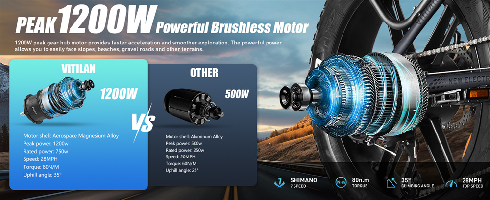 750W borstlös navmotor bak (nominell), 1200W toppeffekt, 80Nm vridmoment. |