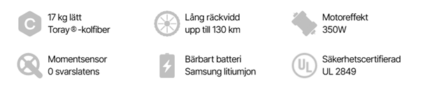 Enligt tillverkaren och recensenter på NewUrtopia.com och Tom's Guide har cykeln följande huvudspecifikationer: