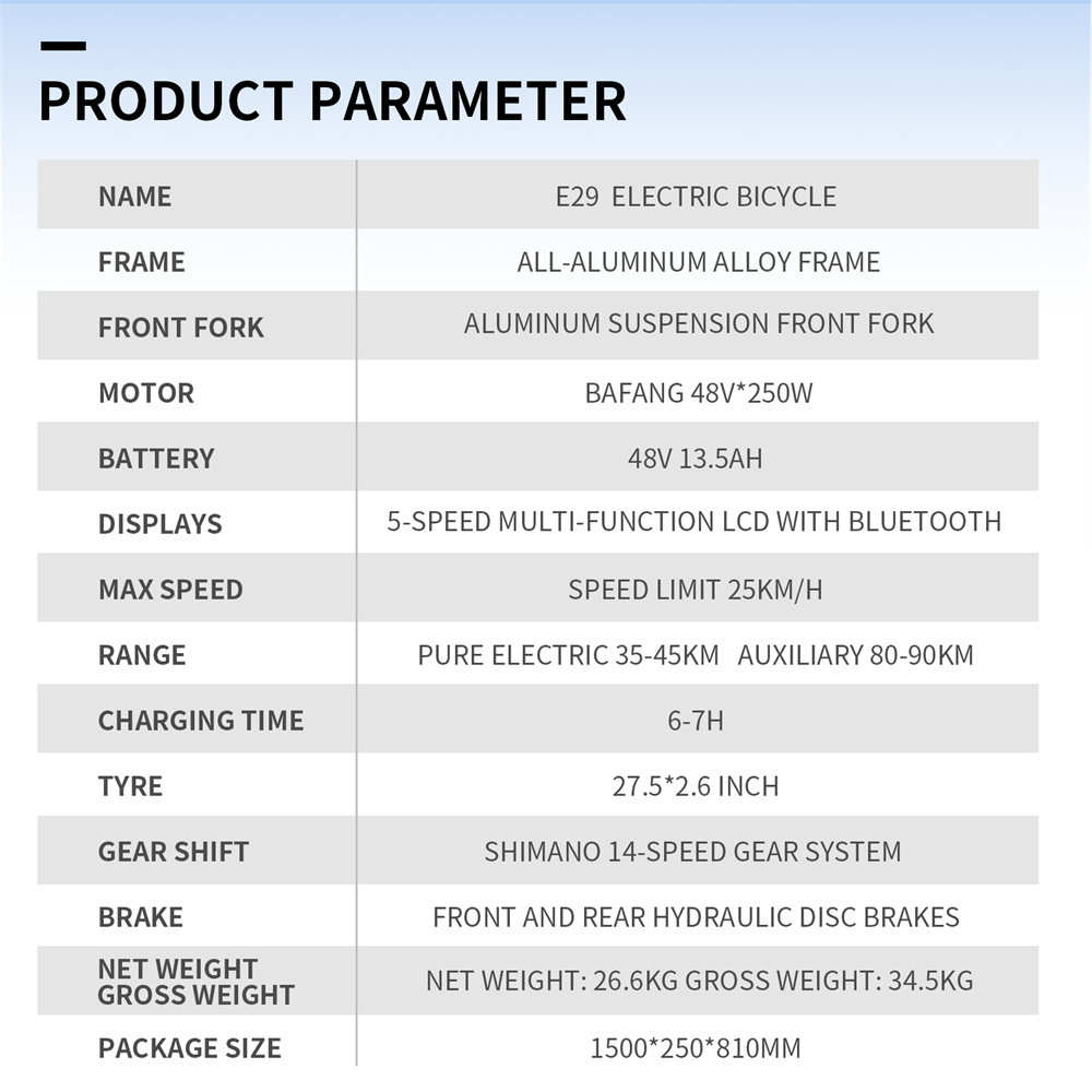 Duotts E29 är en fulldämpad elektrisk mountainbike som kombinerar en pålitlig Bafang-motor med en modern vridmomentsensor (torque sensor) för en naturlig cykelkänsla. Den får goda omdömen för sin robusta konstruktion och komfortabla körupplevelse på både asfalt och skogsstigar.