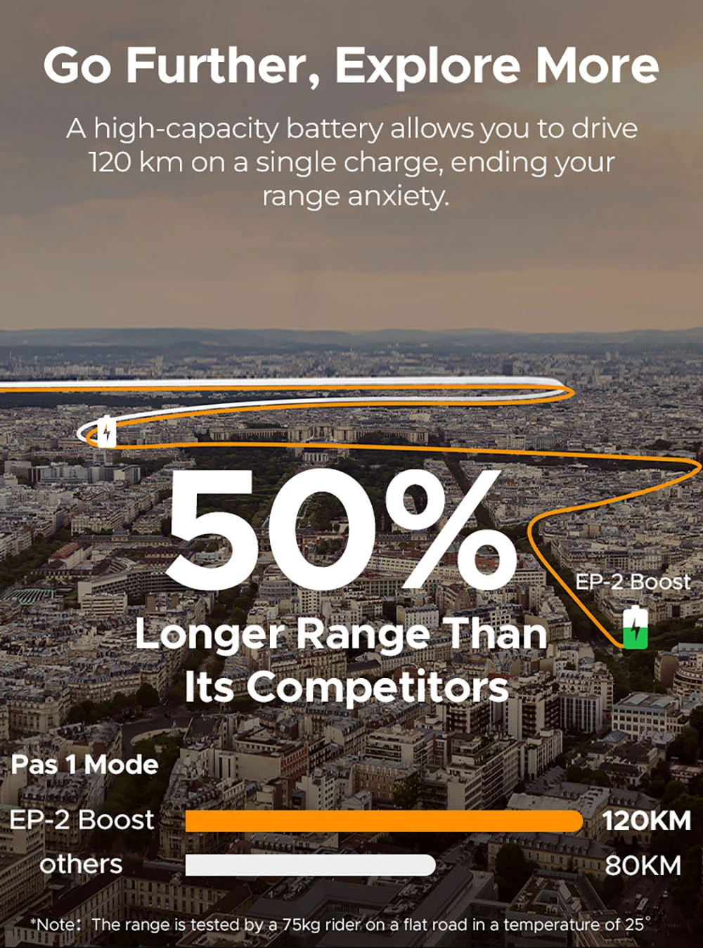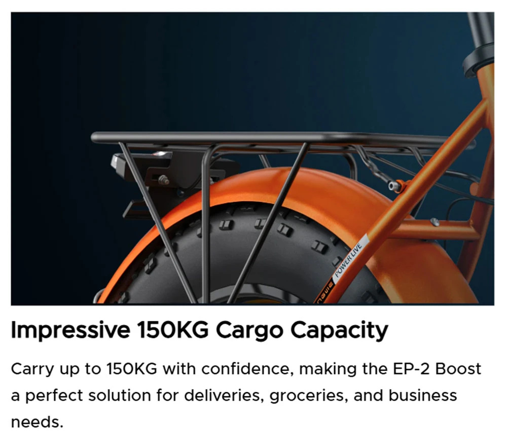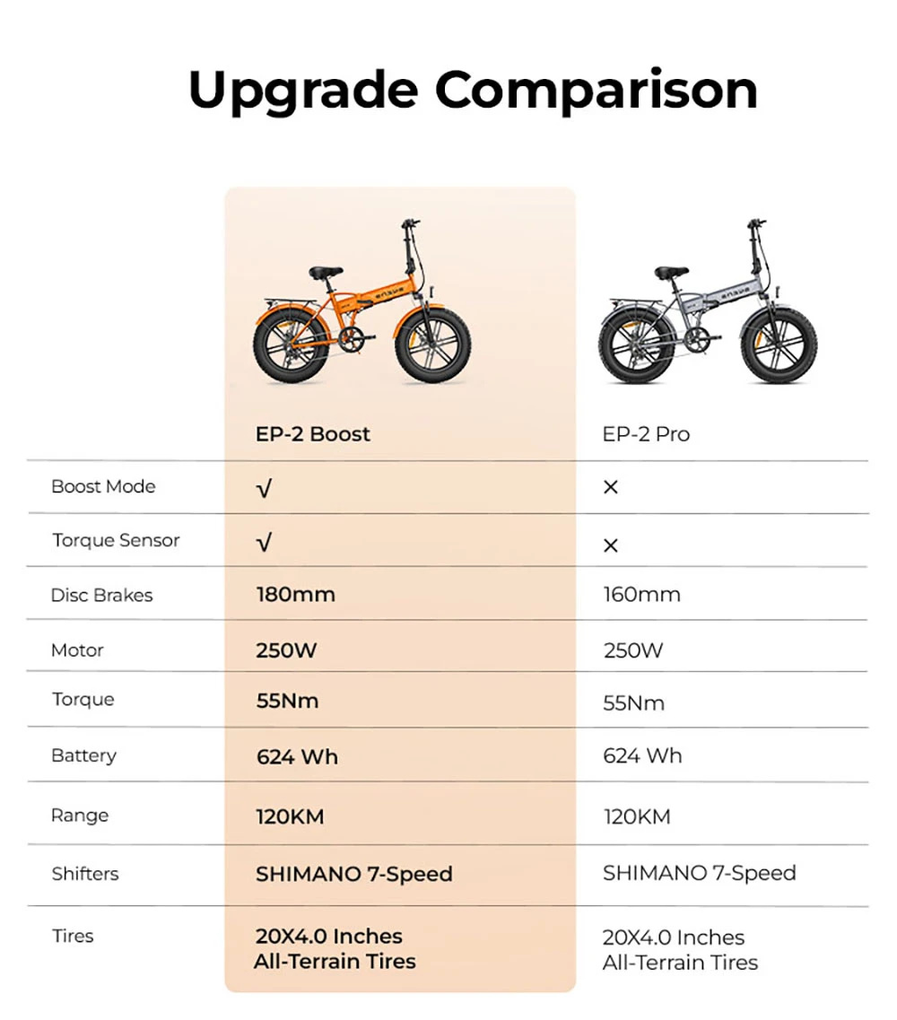 Engwe EP-2 Boost är en hopfällbar fatbike-elcykel som är laglig för bruk på allmän väg i Sverige, med en motor på 250W och en maxhastighet med elassistans på 25 km/h. Den har en momentgivare (torque sensor) för en mer naturlig cykelkänsla och en "boost"-knapp för extra kraft.