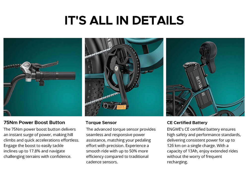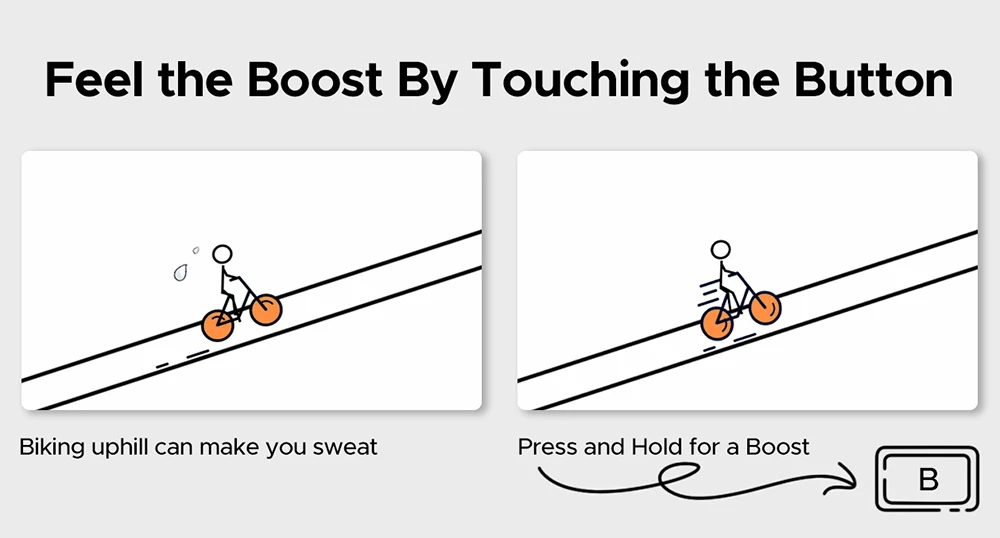 Upplev en omedelbar kraftökning med ENGWE L20 BOOST Step-Thru EBikes 75 Nm kraftboostknapp. Den här funktionen gör backklättringar och snabba accelerationer enkla, så att du enkelt kan ta dig an lutningar upp till 17,8 % och navigera i utmanande terräng med självförtroende.
