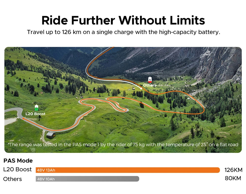 Åk hela vägen med ENGWE L20 BOOST Step-Thru EBikes bärbara batteri. Med en kapacitet på 13 Ah erbjuder det upp till 126 km på en enda laddning i PAS 1-läge, vilket ger dig friheten att njuta av längre turer utan att behöva oroa dig för frekvent laddning.