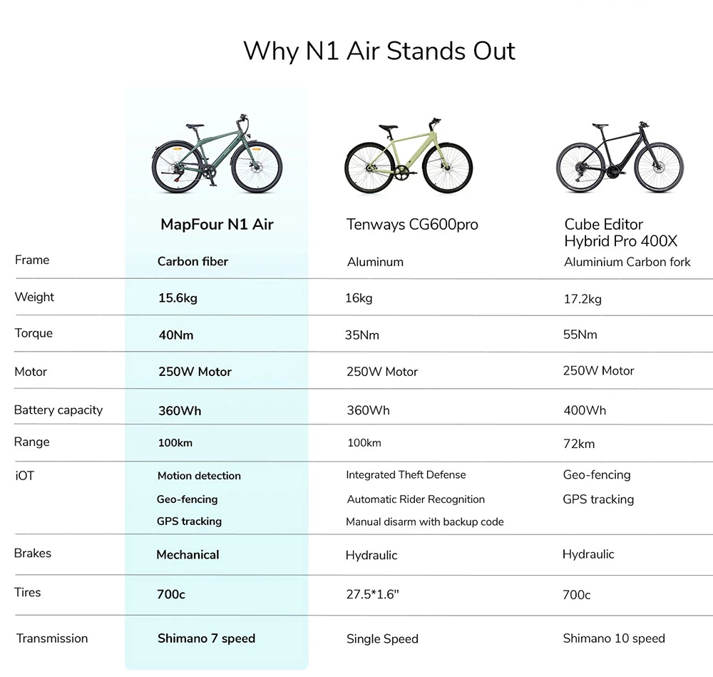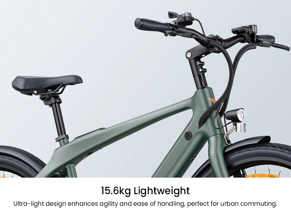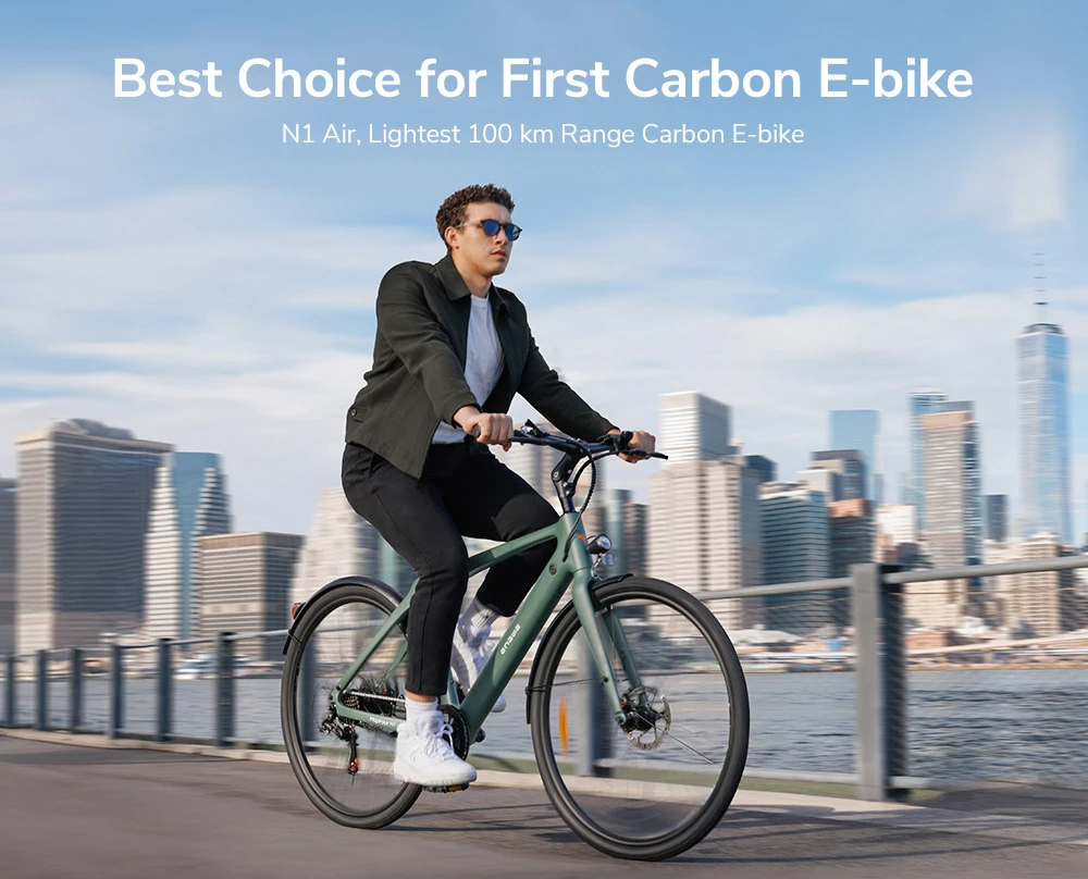 Engwe MapFour N1 Air är en ultralätt stadselcykel med kolfiberram och en smidig Mivice-motor med momentsensor, designad för stadspendling. Den har en räckvidd på upp till 100 km och en toppfart på 25 km/h, vilket gör den laglig inom EU.