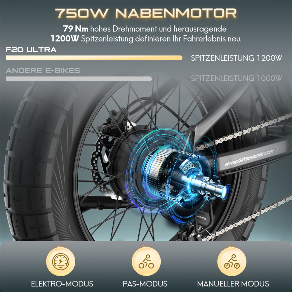 750 W baknavsmotor (upp till 1200 W toppeffekt) med 79 Nm vridmoment. |