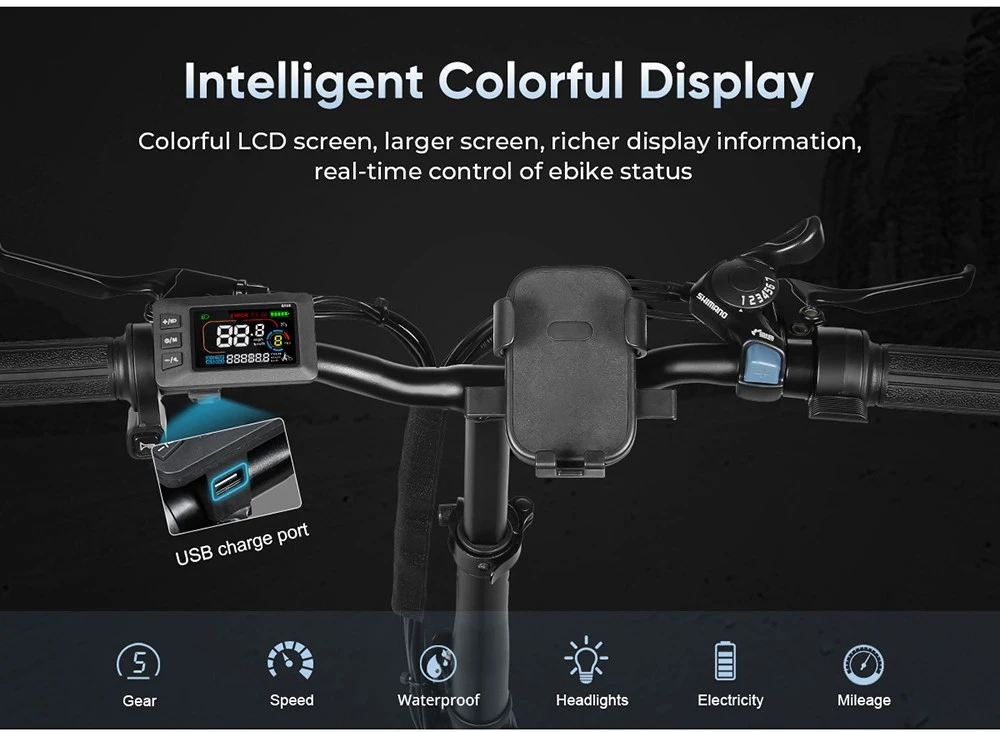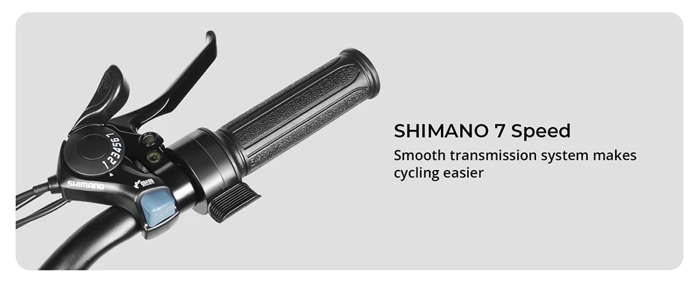 Håll dig informerad och ha kontroll med CY20:s LCD-skärm . Skärmen visar realtidsdata om hastighet, batteritid, tillryggalagd sträcka och pedalassistansnivåer. Cykeln har också en avtagbar gasreglage och en Shimano 7-växlad växelreglage , vilket gör att du enkelt kan växla mellan olika körlägen och terräng. De fem nivåerna av pedalassistans låter dig justera cykelns effekt baserat på dina körförhållanden.