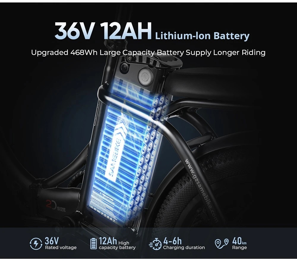 Utrustad med ett hållbart 36V 12Ah- batteri har Samebike CY20 en räckvidd på upp till 40+40 km på en enda laddning. Batteriet är enkelt att installera och ta bort, vilket möjliggör snabb laddning och ökad bekvämlighet. Dess lätta struktur säkerställer att cykeln förblir enkel att hantera, även under längre turer. Den utökade räckvidden gör CY20 idealisk för både dagliga pendlingar och längre helgäventyr.