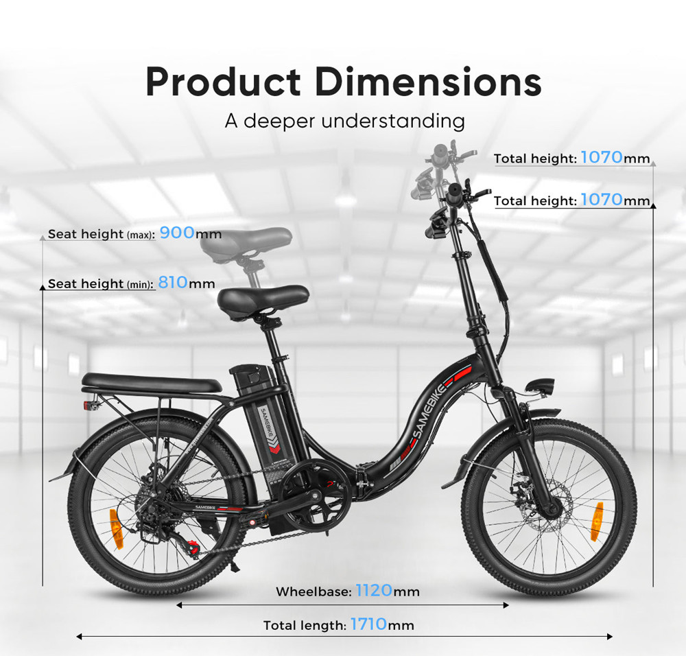 Samebike CY20 är designad för bekvämlighet och har en snabbfällbar mekanism som gör att du kan vika ihop och förvara cykeln på några sekunder. Den hopfällda storleken på 0,8 x 0,5 x 0,6 m gör den enkel att få plats i bilens bagageutrymme, garderober eller små förvaringsutrymmen. Med en vikt på bara 25 kg är CY20 tillräckligt lätt för att bäras med en hand, vilket gör den till ett utmärkt alternativ för pendlare och resenärer. Dess kompakta design säkerställer att du kan ta den med dig överallt utan problem.