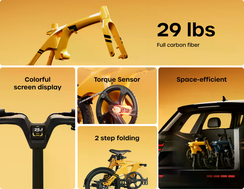 Urtopia Carbon Fold 1 är en ultralätt, hopfällbar elcykel i kolfiber designad för stadspendling. Den väger endast 13,2 kg (29 lbs), vilket gör den till en av de lättaste hopfällbara elcyklarna på marknaden.