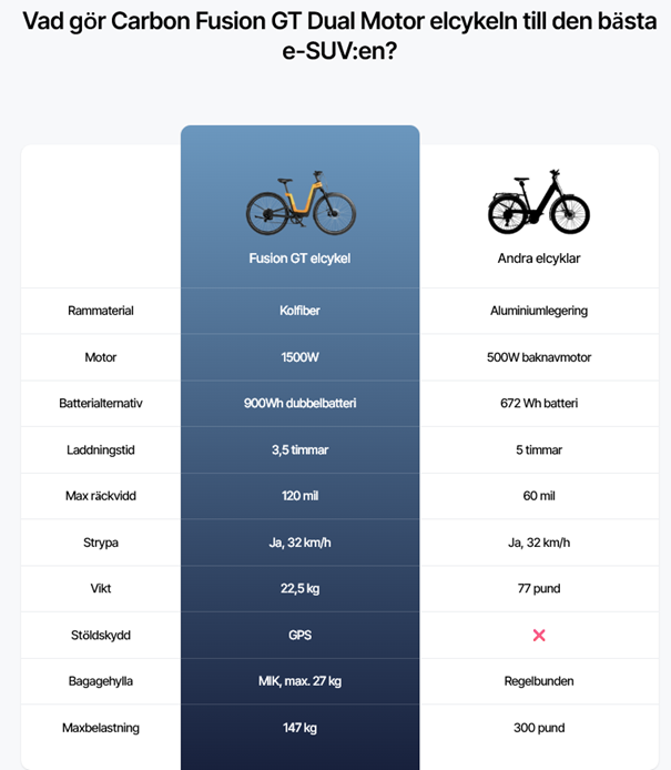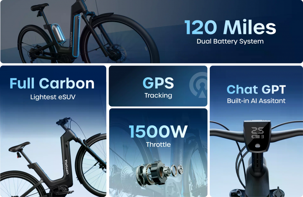 Urtopia Carbon Fusion GT är en lätt all-terräng elcykel med dubbla motorer och dubbla batterier, kolfiberram och smarta funktioner som GPS-spårning och röststyrning. Den beskrivs av recensenter som kraftfull, bekväm och full av teknik.