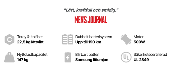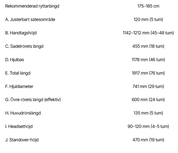 Enligt tillverkarens och återförsäljares uppgifter har cykeln följande nyckeldata: