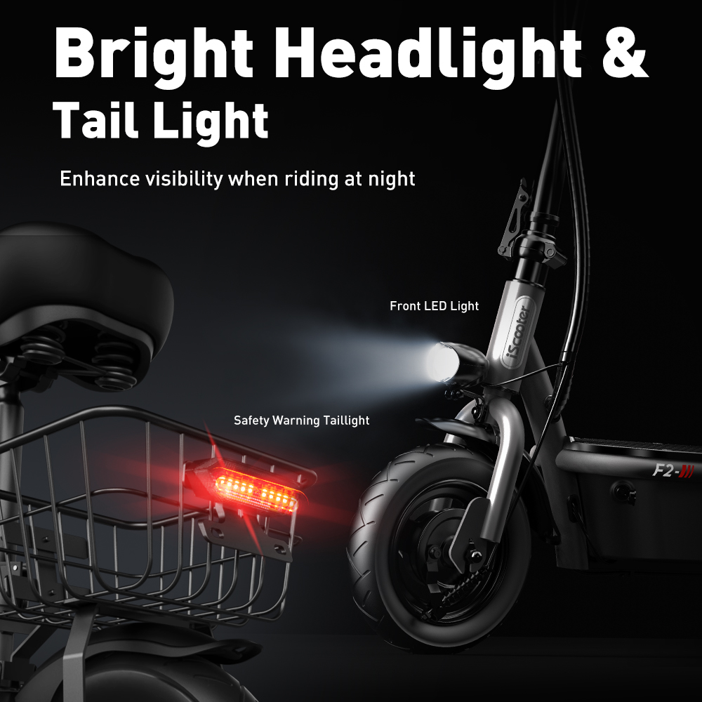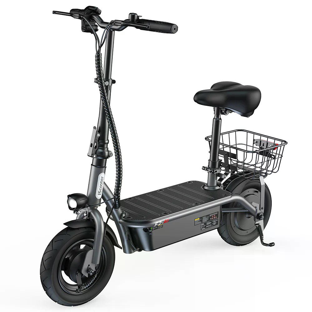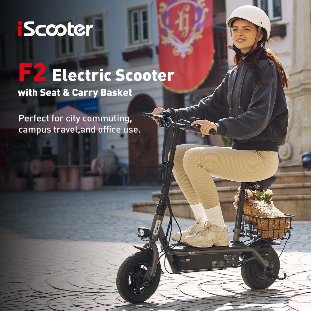 iScooter F2 är en elsparkcykel som utmärker sig genom att levereras med ett avtagbart säte och en korg, vilket gör den anpassad för bekväm stadspendling och enklare ärenden. Den marknadsförs ofta som en prisvärd modell för vuxna som prioriterar komfort.