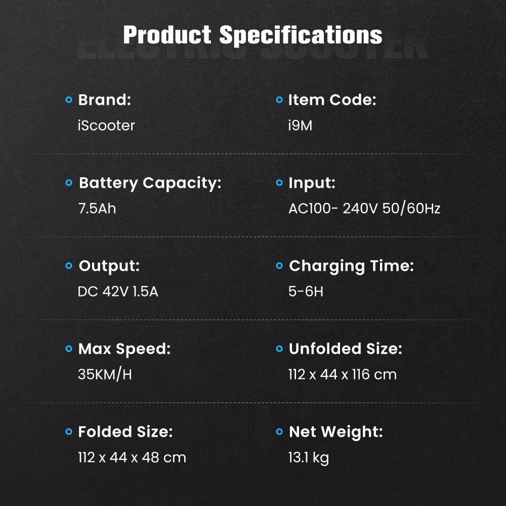 iScooter i9M är en kraftfull och portabel elsparkcykel som är särskilt framtagen för smidig stadspendling. Den erbjuder en balans mellan låg vikt och prestanda, vilket gör den lämplig för användare som behöver kombinera körning med att bära scootern på tåg eller i trappor.
