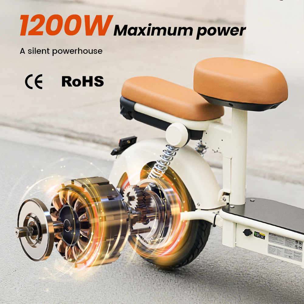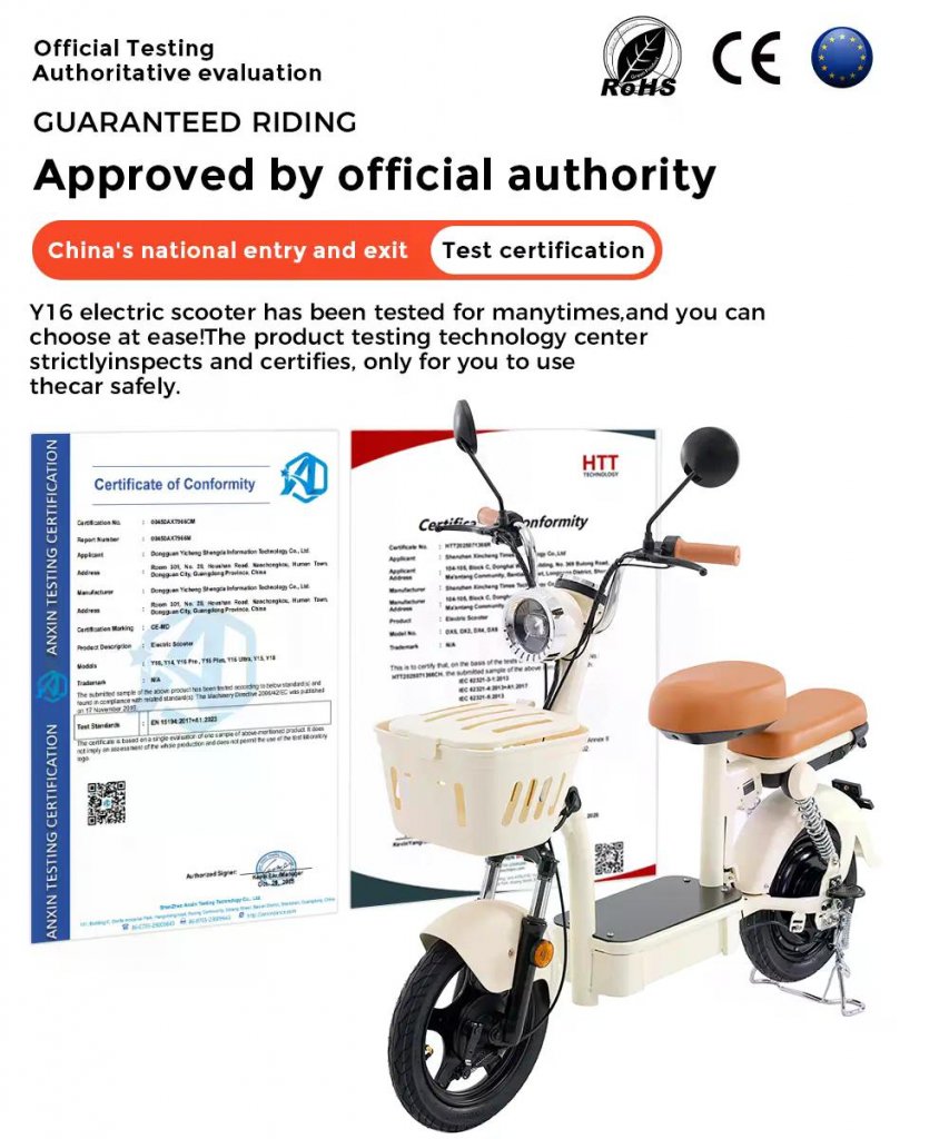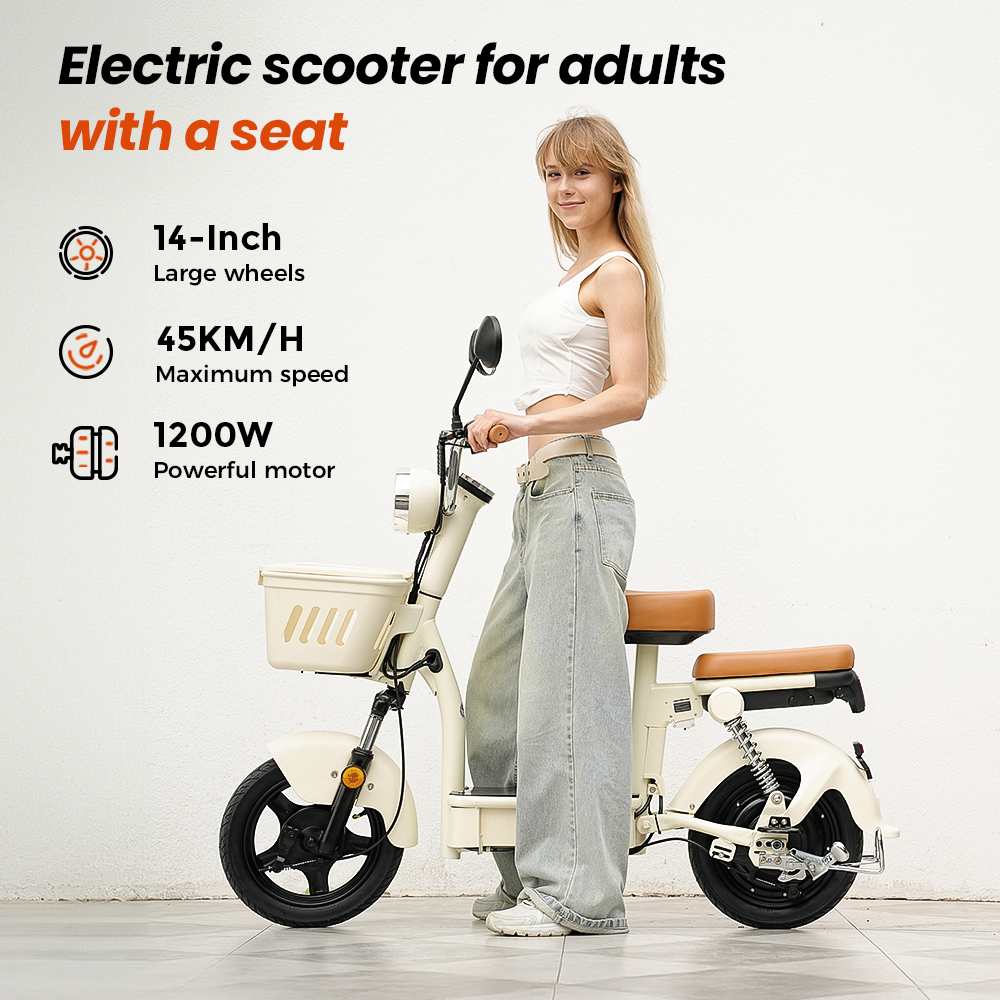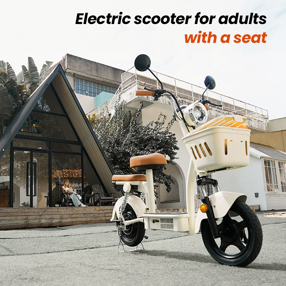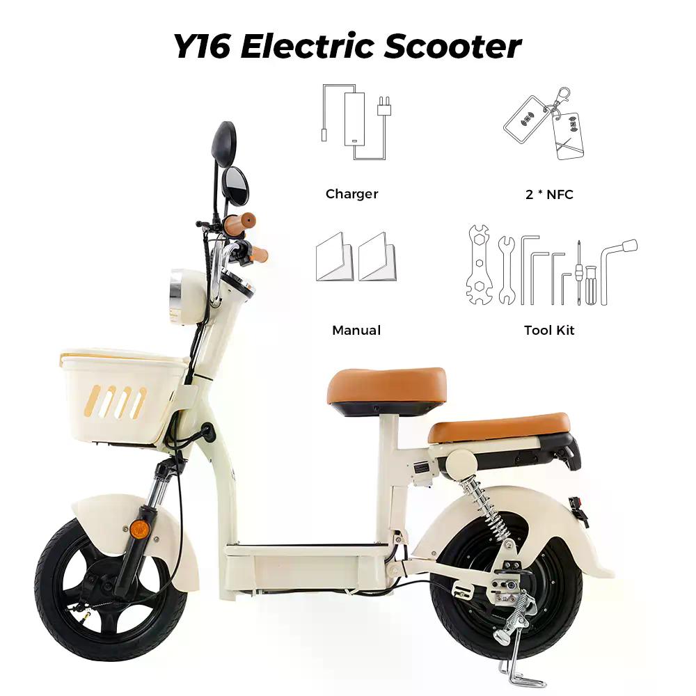iScooter Y16 är en robust elscooter med säte, designad för bekväm stadspendling och längre turer. Den utmärker sig med en kraftfull motor, lång räckvidd och praktiska funktioner som integrerad korg.