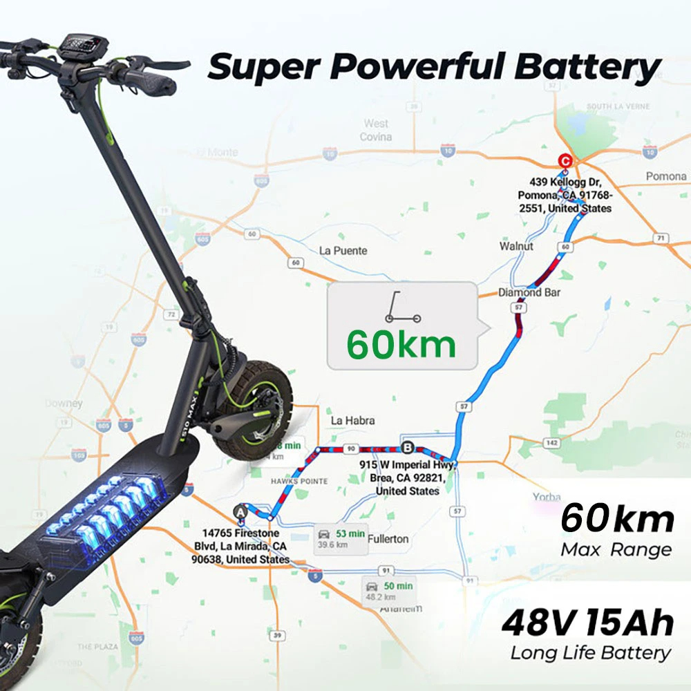 - 15Ah / 48V Li-ion batteri ( ingår i produkten ) för max 60km räckvidd.