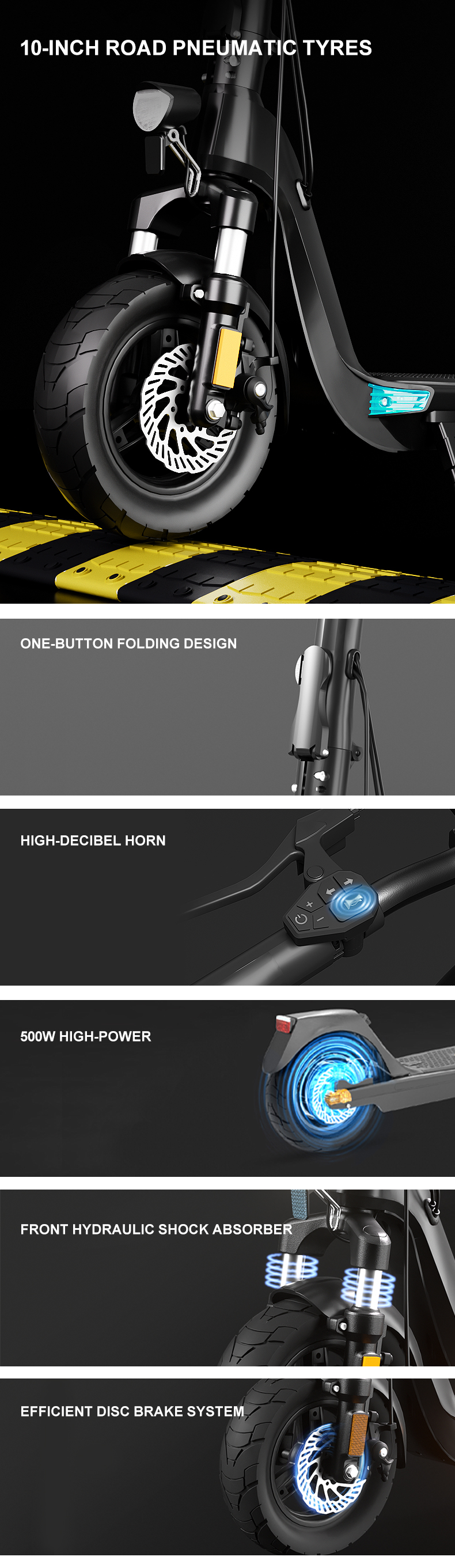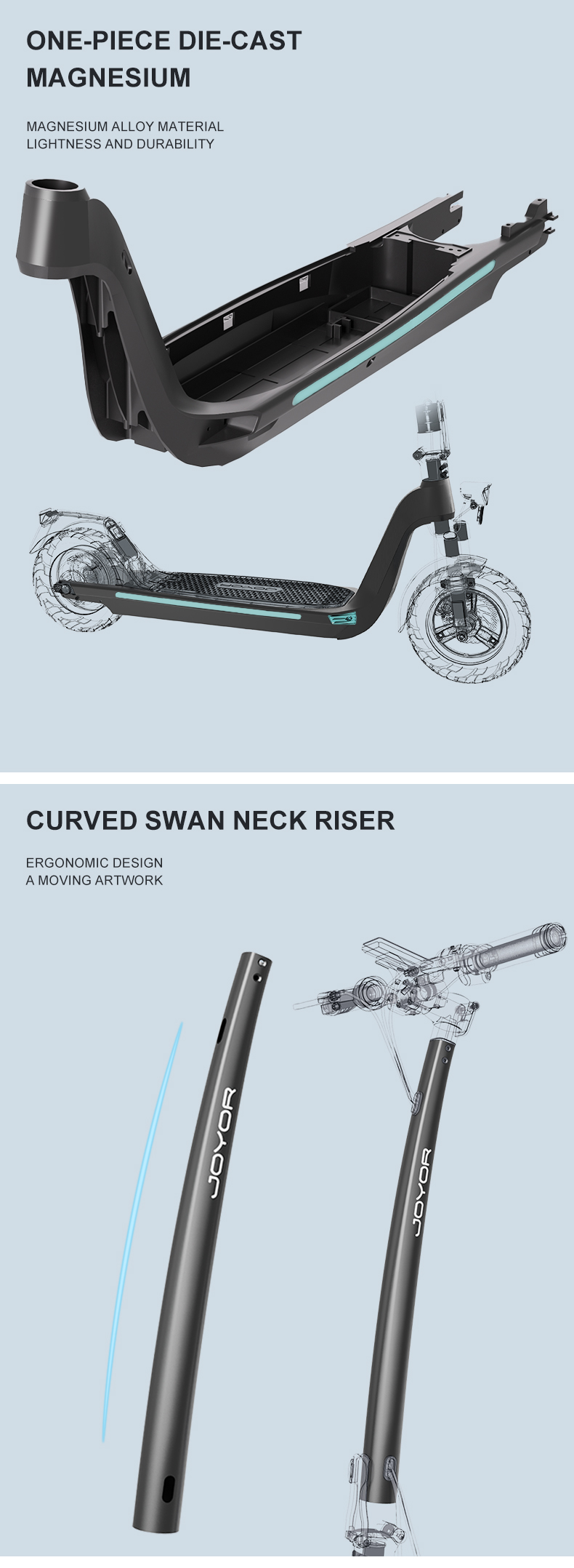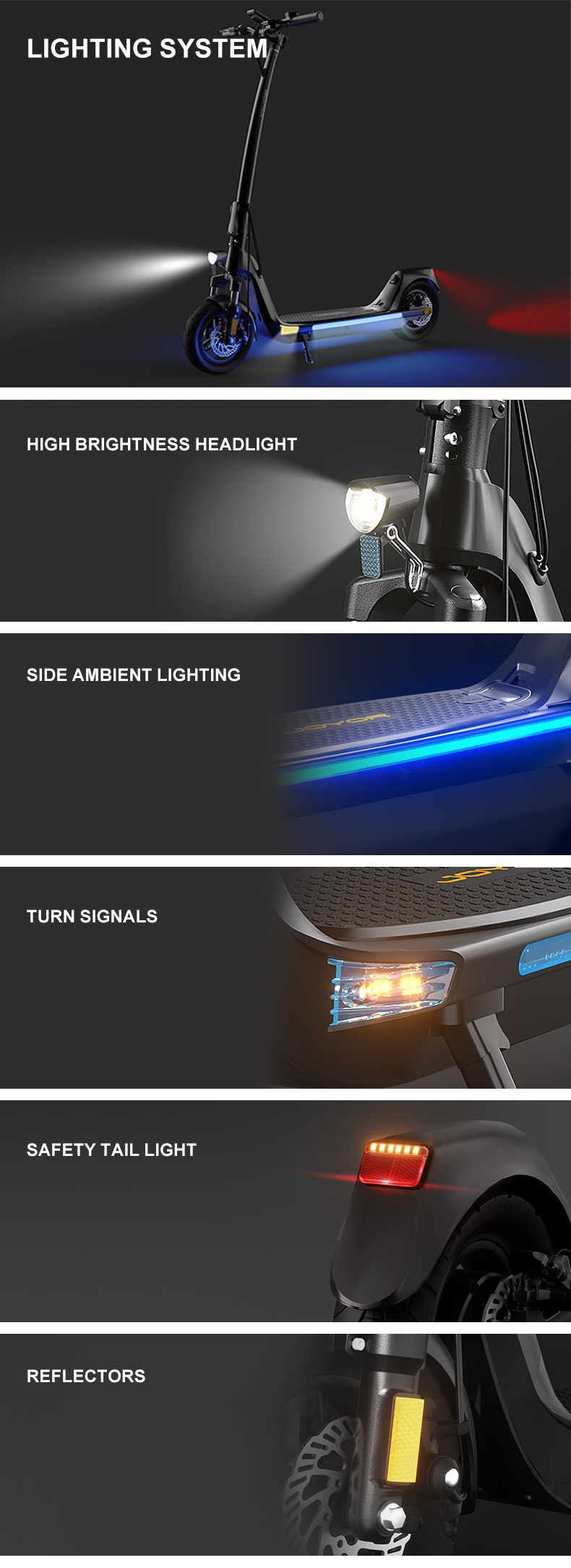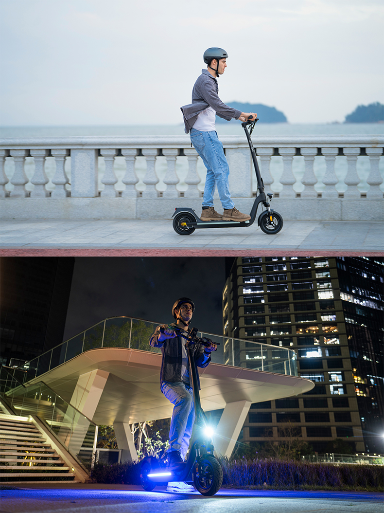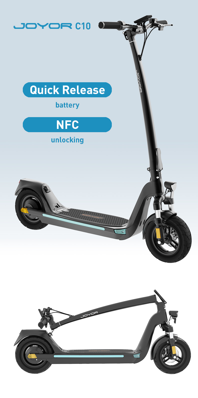 Joyor C10 är en mångsidig elscooter optimerad för stadspendling med en kraftfull 500W motor och ett praktiskt löstagbart 48V 10,4Ah batteri för enkel laddning. Den erbjuder en räckvidd på upp till 40 km och kan i olåst läge nå en topphastighet på 40–45 km/h.