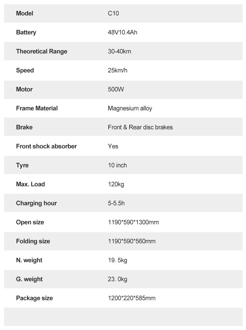 Tekniska specifikationer (Joyor C10 / C10E)