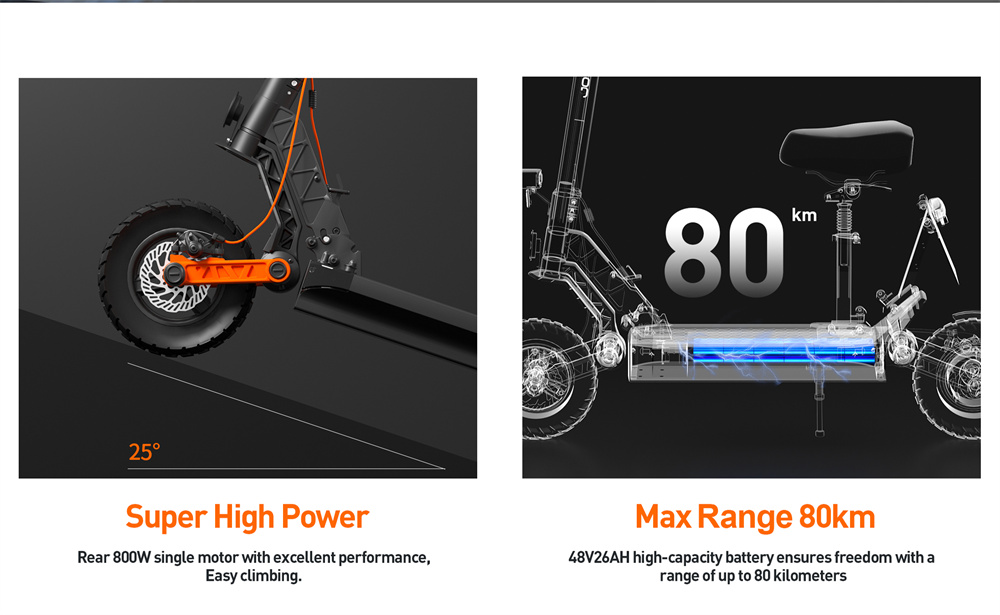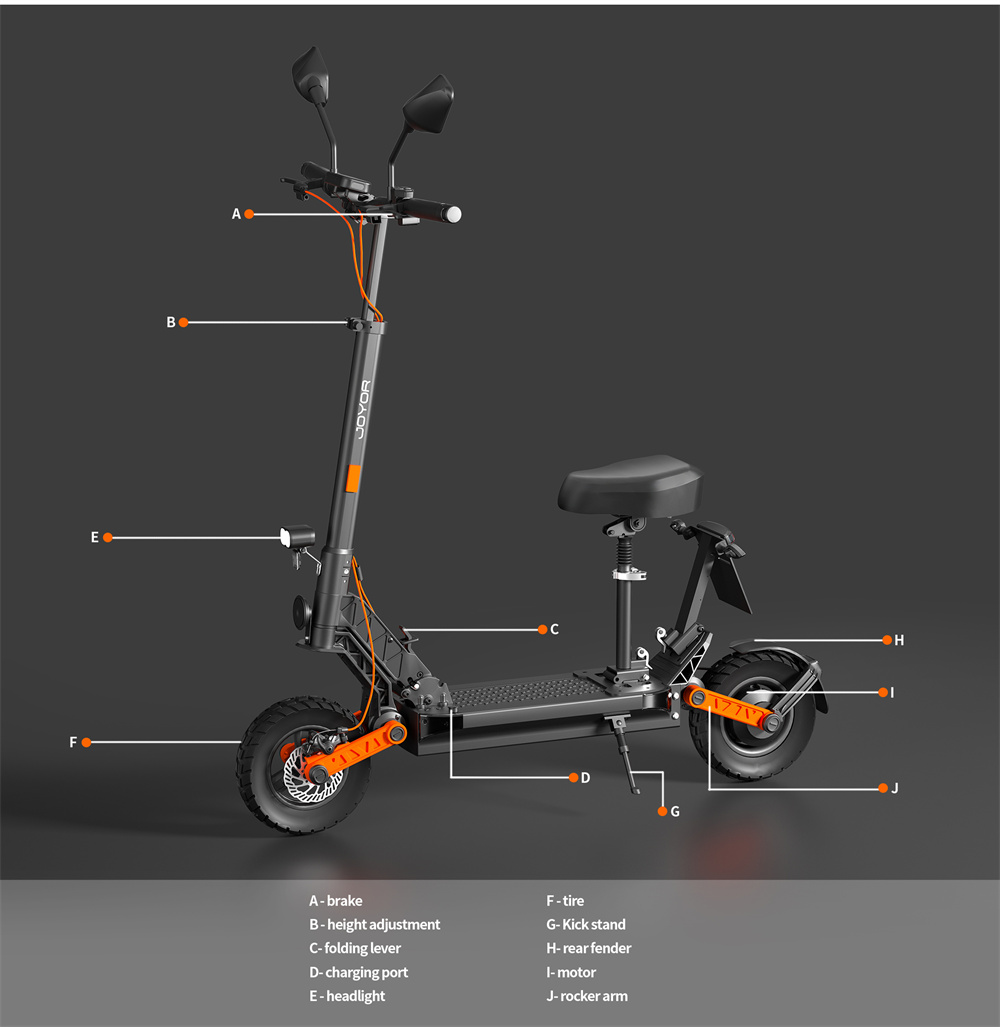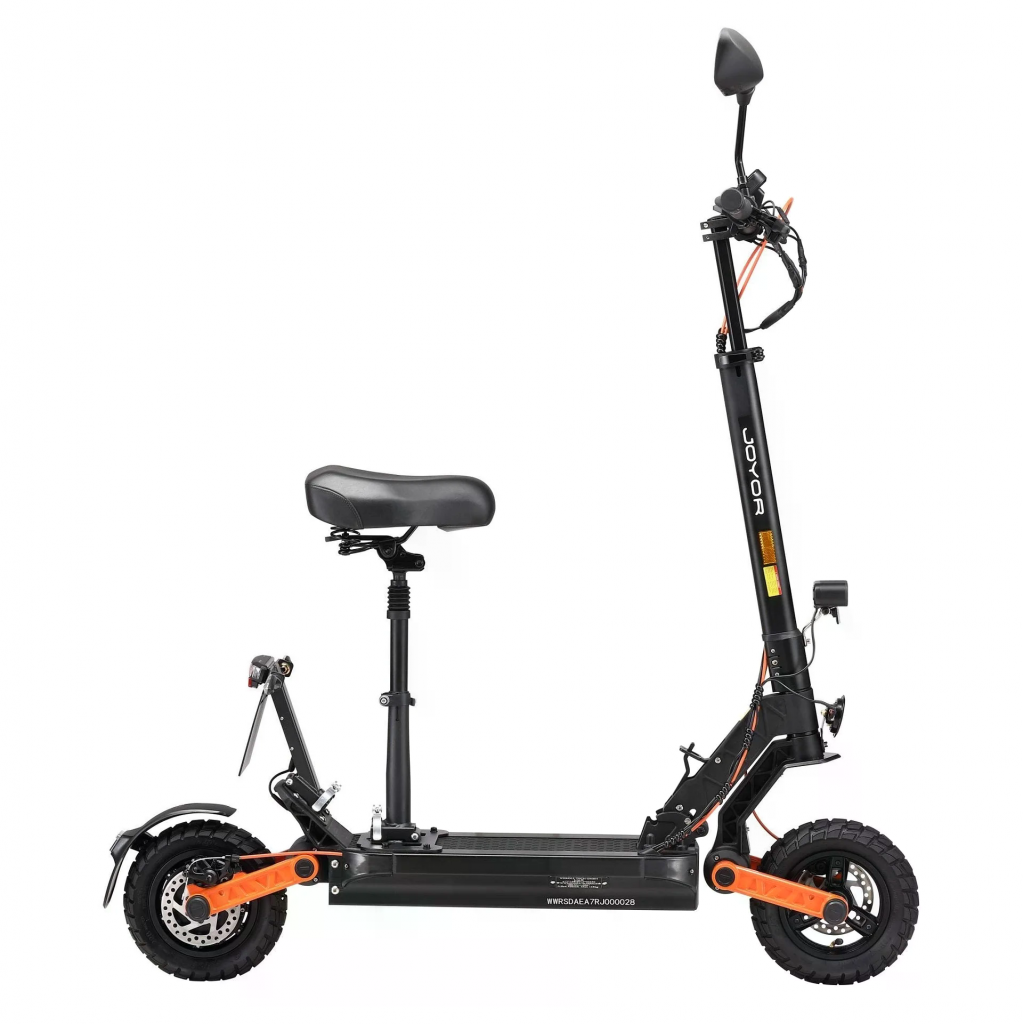 Joyor S8E är en hopfällbar elsparkcykel designad för komfort och säkerhet, med en 800W motor, 10-tums terrängdäck och en räckvidd på upp till 80 km. Den har funktioner som skivbromsar fram och bak, stötdämpning och levereras ibland med ett avtagbart säte.