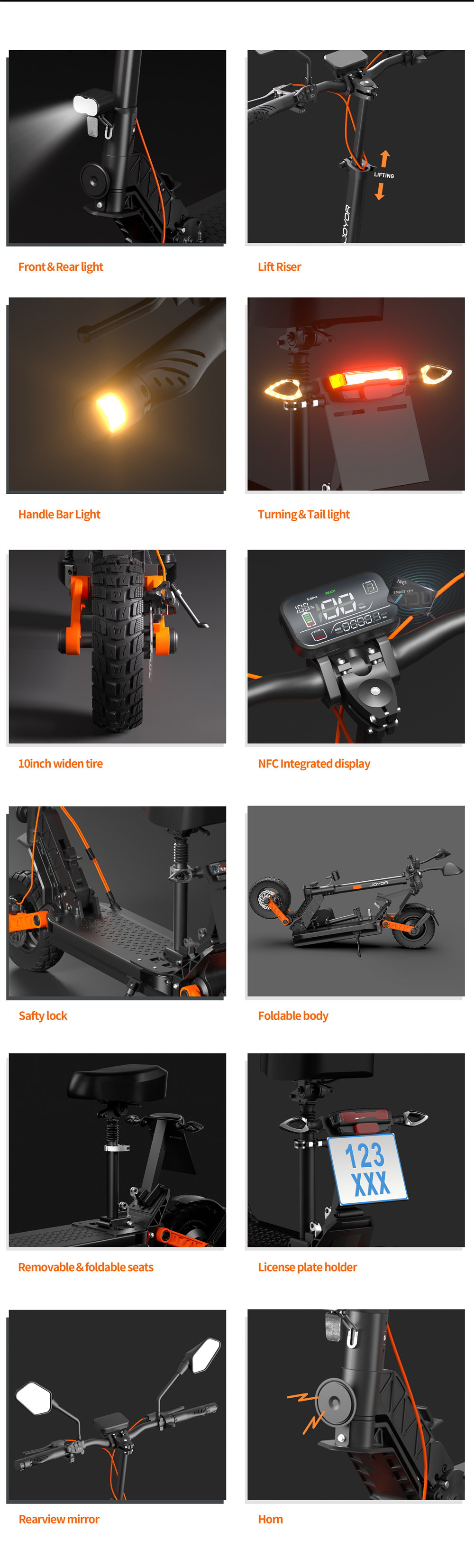 Hopfällbar design, NFC-kortlåsning, varningsljus bak, ibland avtagbart säte |
