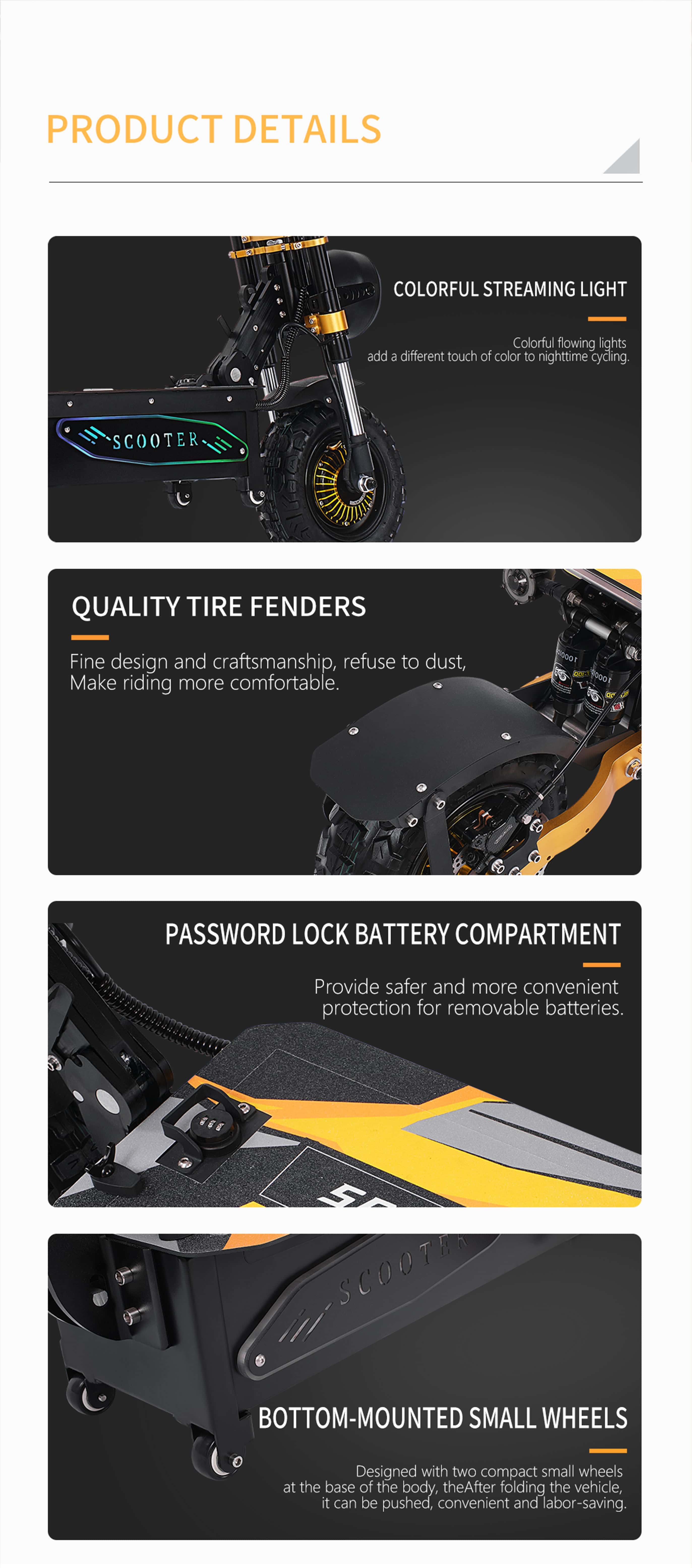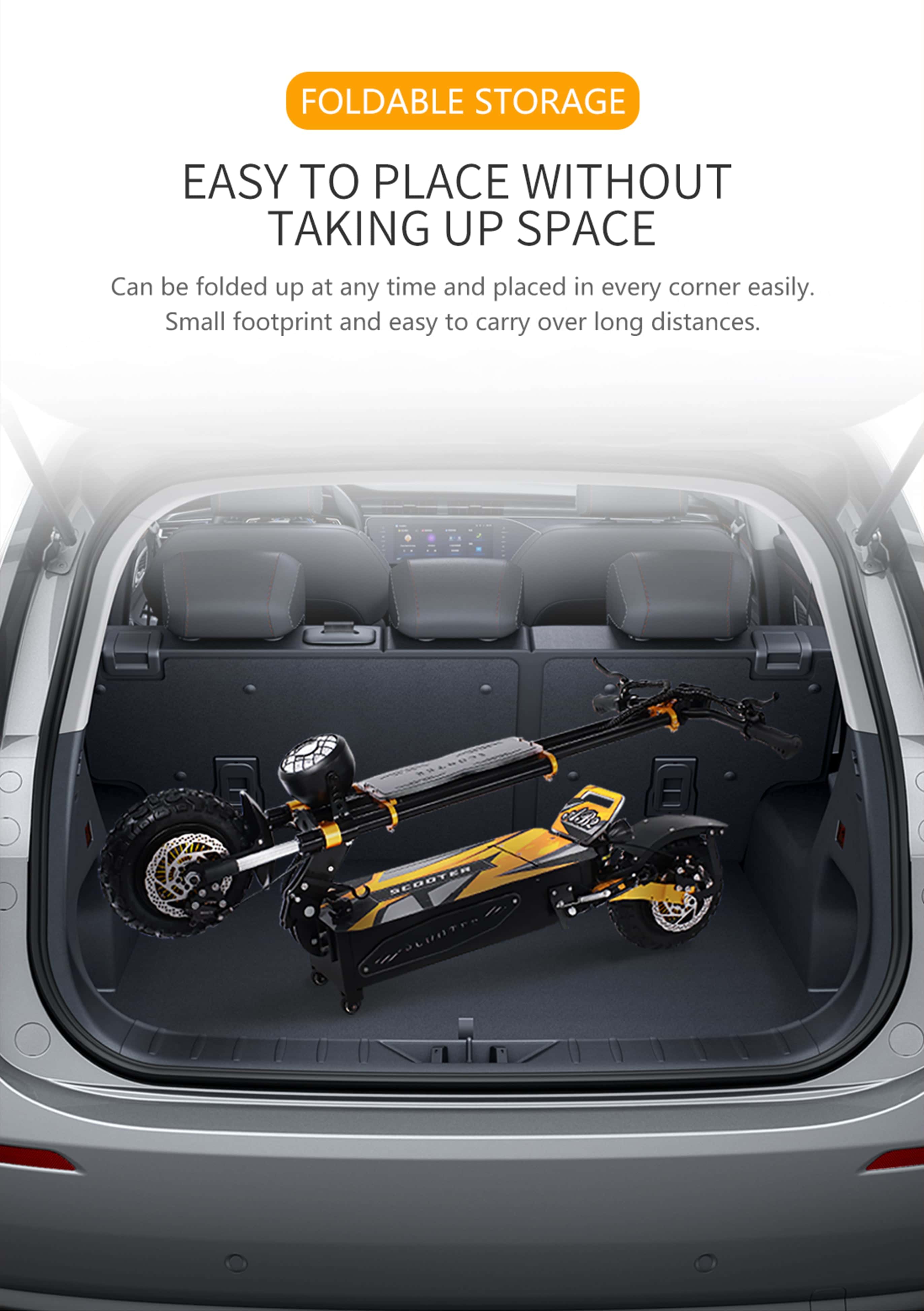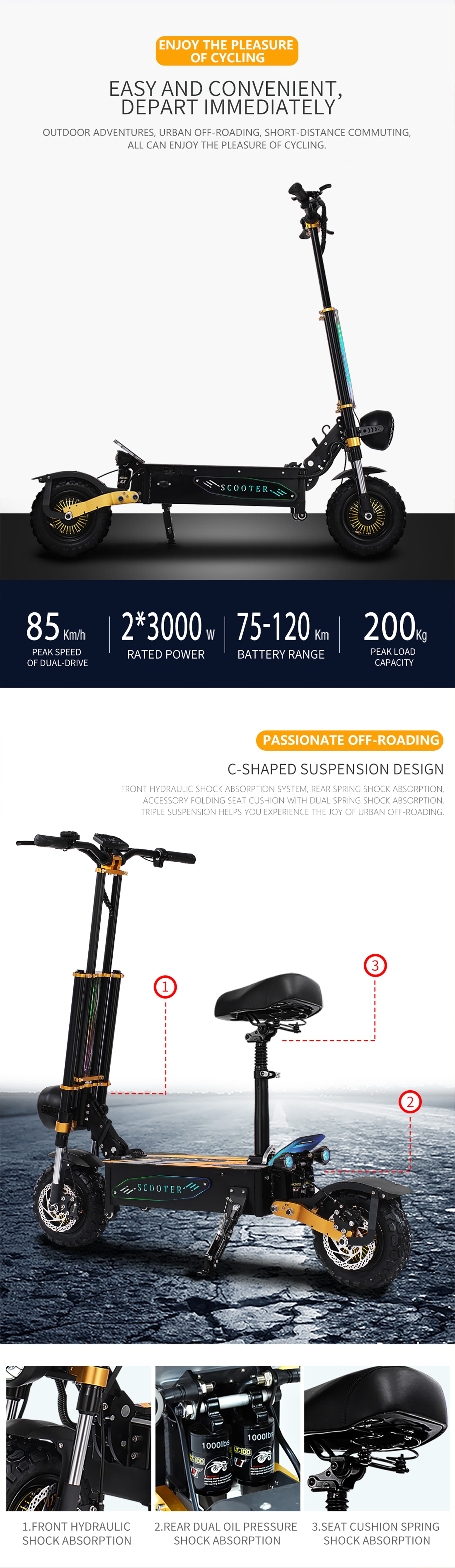 | Bromsar | Hydrauliska skivbromsar fram + bak | Motoreffekt | 3000W*2 Dubbla motorer |