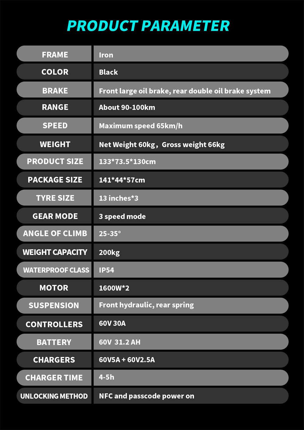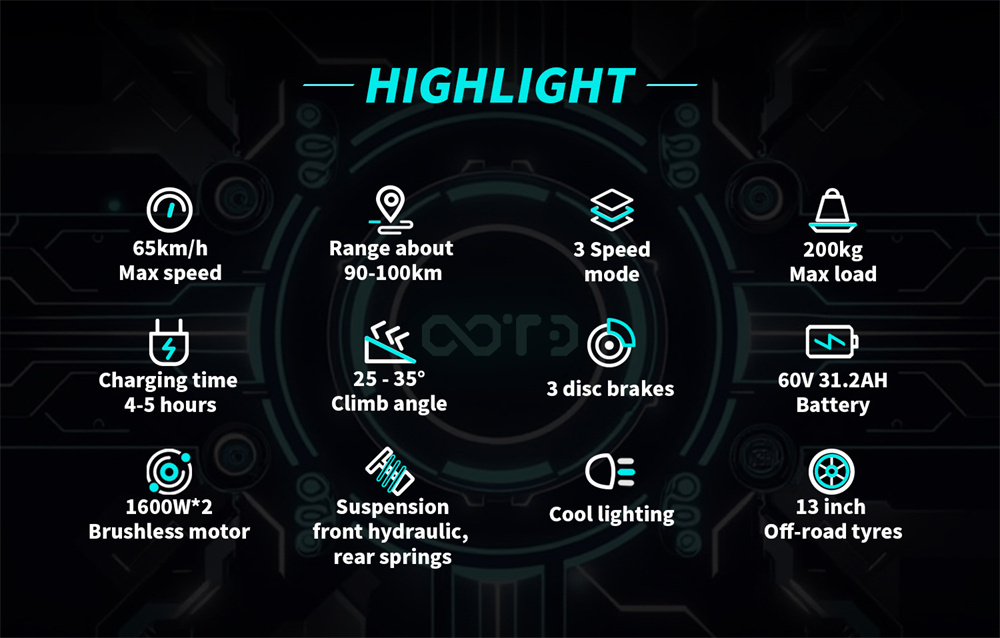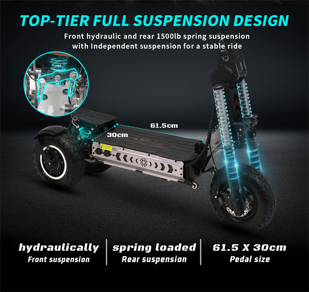 OOTD T30 är utrustad med ett fullfjädrat dämpningssystem som kombinerar främre hydrauliska stötdämpare och bakre fjädring på 1500 lb. Den oberoende fjädringen gör att du glider över gupp och ojämnheter utan att det påverkar komforten. Du får en smidig och stabil körning, oavsett underlag.