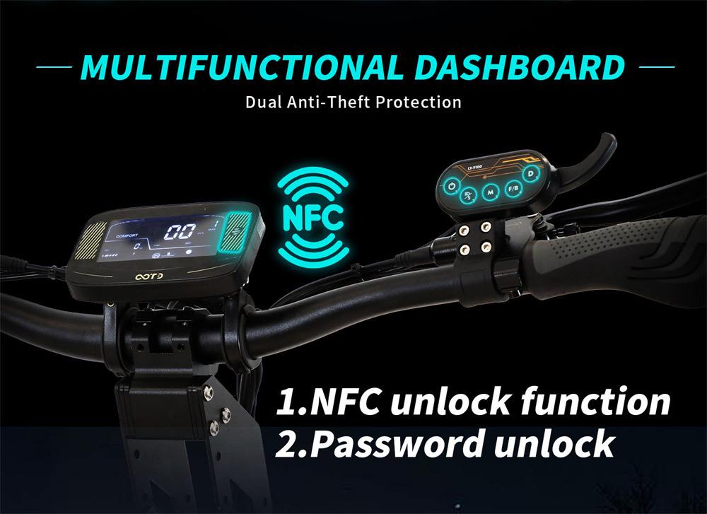 OOTD T30 har en smart och tydlig digital display som visar hastighet, batterinivå, körläge och mer. Dessutom får du dubbel stöldskyddsfunktion med NFC-upplåsning och lösenordslås. Det gör att du enkelt kan skydda din elsparkcykel från obehörig användning – samtidigt som du får en modern och futuristisk känsla varje gång du startar den.